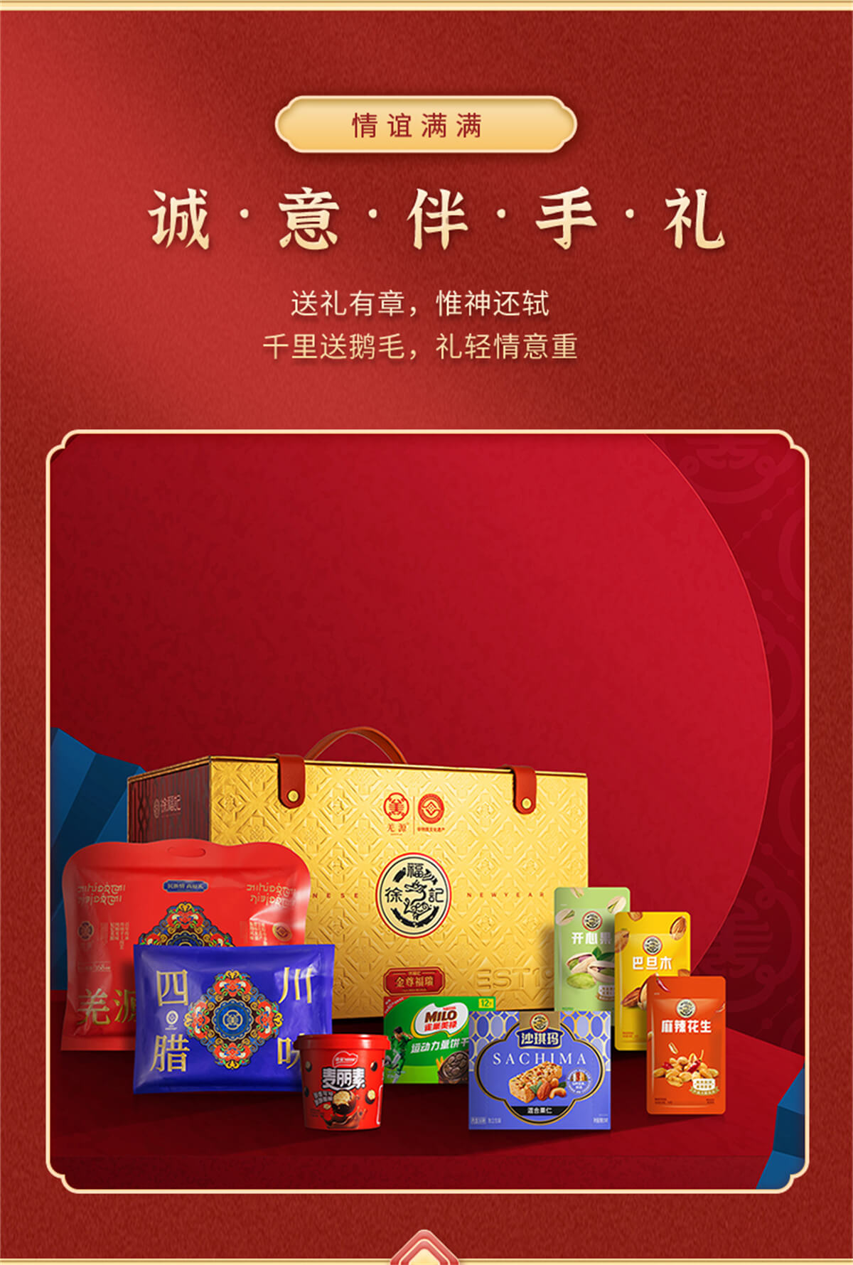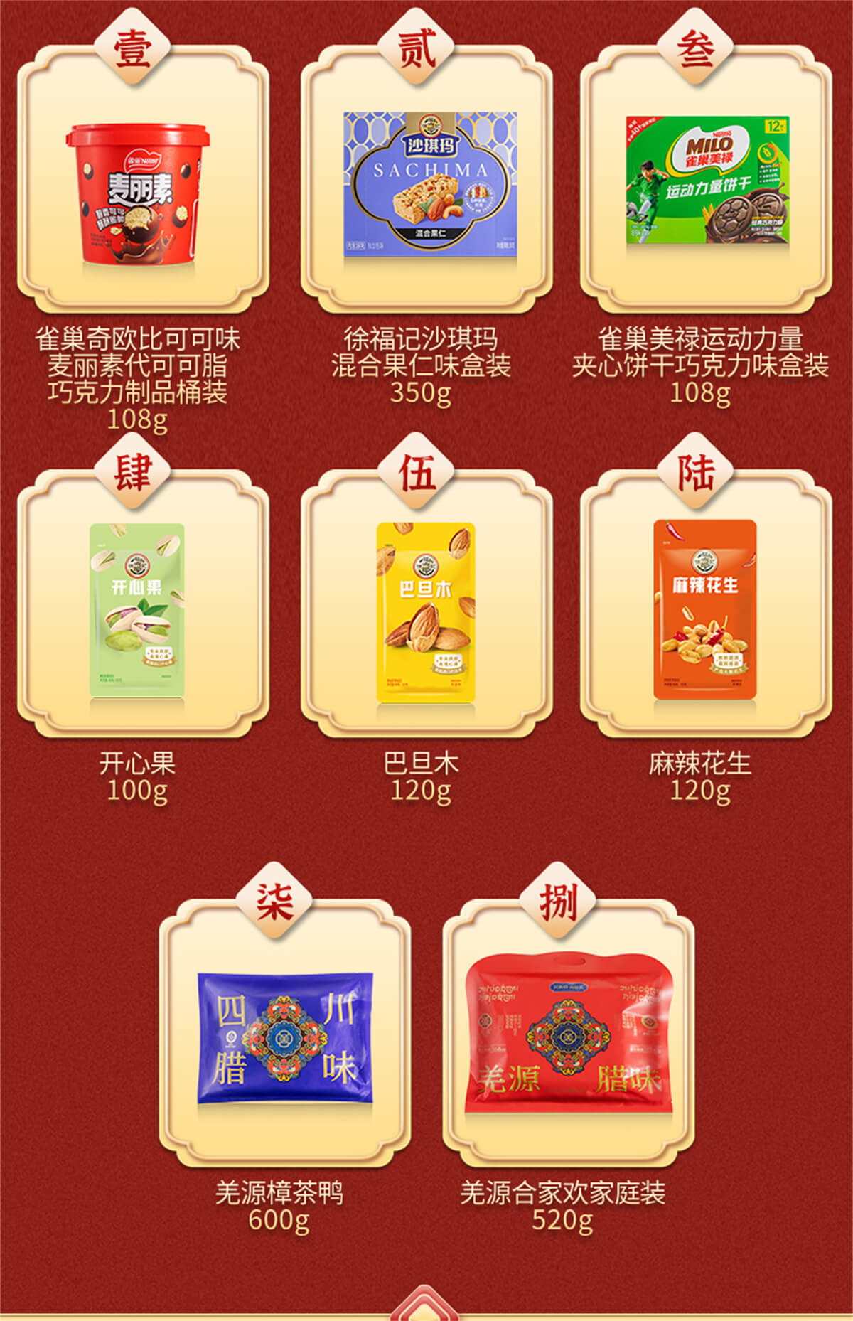 金尊福瑞 發布時間:2025-01-04點擊:37 團購優惠請聯系我們 內容物:雀巢奇歐比可可味麥麗素代可可脂巧克力制品桶裝108g徐福記沙琪瑪混合果仁味盒裝350g雀巢美祿運動力量夾心餅干巧克力味盒裝108g開心果100g巴旦木120g麻辣花生120g羌源樟茶鴨600g羌源合家歡家庭裝(農家土豬煙熏五花肉100g、農家土豬煙熏腿肉100g、金銀肝100g、煙熏拱嘴100g、農家土豬煙熏麻辣香腸120g) 請填寫您的信息 提交留言